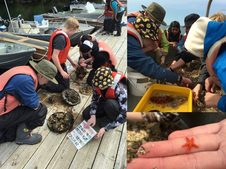 It was a beautiful day in Bamfield today. Each group had a chance to get out on the Alta. This boat took us out into Trevor Channel and over to the Wizard Islets to do a dredge. It was amazing to see all of the organisms that came up in the shovel including many varieties of sea stars, huge sea cucumbers, worm casings, crabs, nudibranchs. We also had the opportunity to see large groups of seals lounging out on the rocks while the oystercatchers flew by.