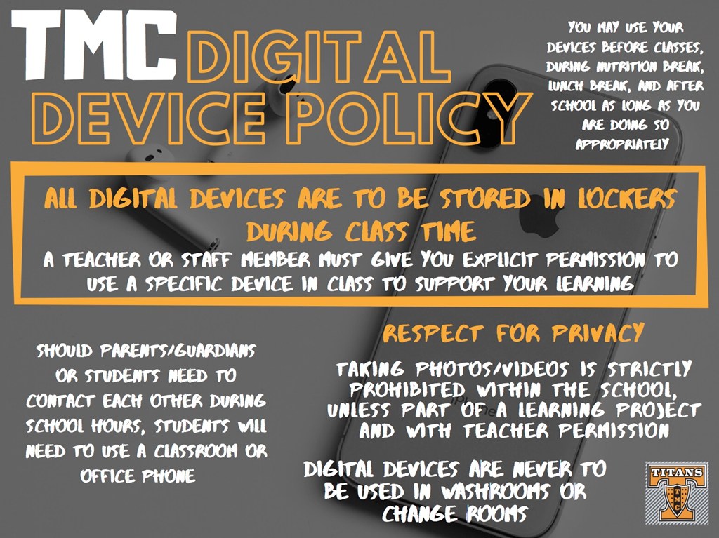 All students must keep cell phones and all digital devices in their lockers during class time and during class changes, unless they have explicit permission from their teacher or a TMC Staff member to use the specific device in class to support their learning.