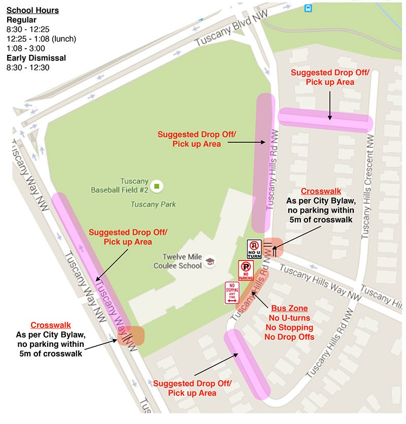TMC is a very busy place, especially at bell times with students being dropped off or picked up. These areas can become quite congested with vehicles and daunting for pedestrians. Please refer to the attached Suggested Drop Off/Pick Up Areas document that details suggested areas for pick up and drop off, cross walks as well as areas where no stopping and/or U-turns are allowed. Thank you for your efforts in ensuring these times and areas are as safe as possible for our students.